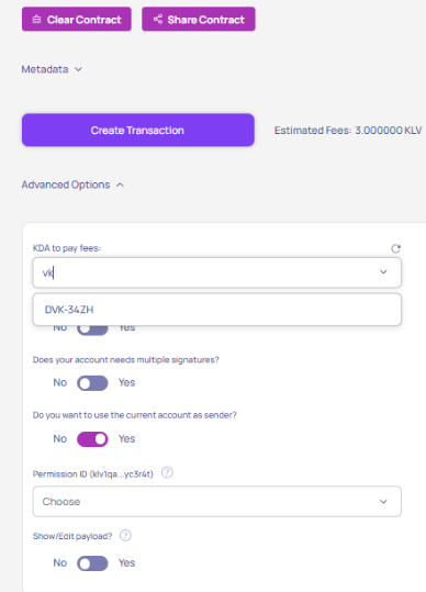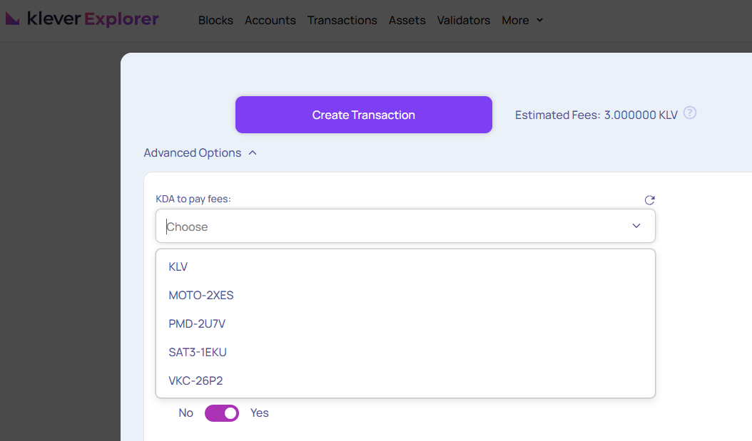 Issue: K5 shows VKC in fee selector, but tx fails with “Error to calculate”. When trying to make a transaction through Kleverscan, VKC does not appear in the drop-down list with eligible KDAs.